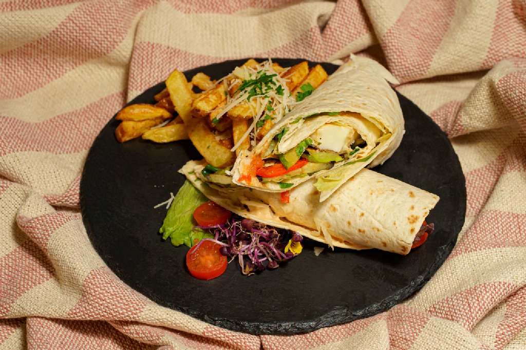 chiflă albă, vânătă, dovlecel, ardei gras, ceapă, brânză Halloumi, sos pesto, roșii, cartofi, usturoi, parmezan, pătrunjel