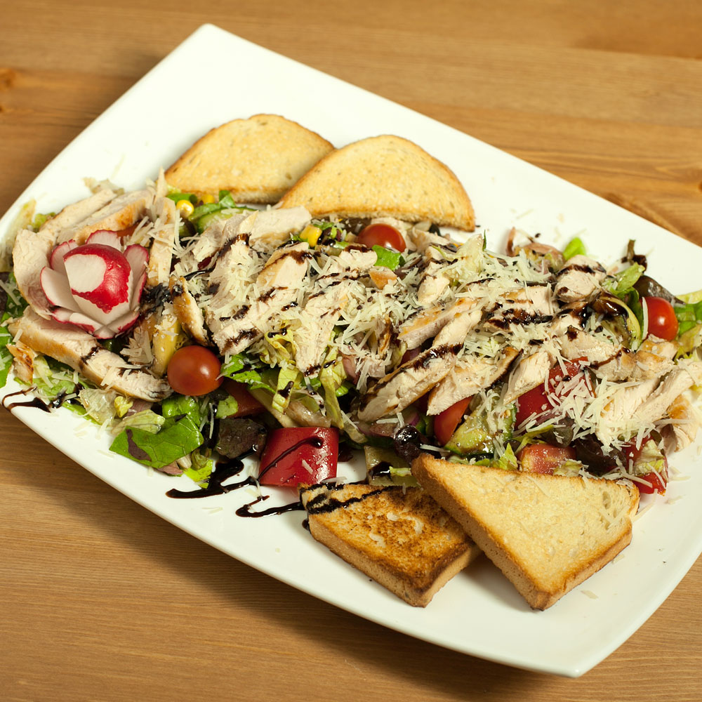 mix salată, piept de pui la grătar, roșii, castraveți, ceapă, ardei gras, porumb, măsline, cococi, parmezan