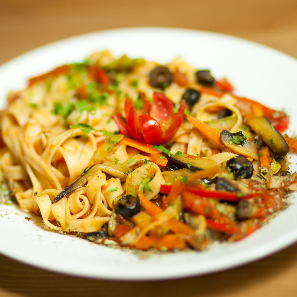 tagliatelle, vinete, dovlecei, morcov, măsline, roșii, ciuperci, sos de roșii, pătrunjel